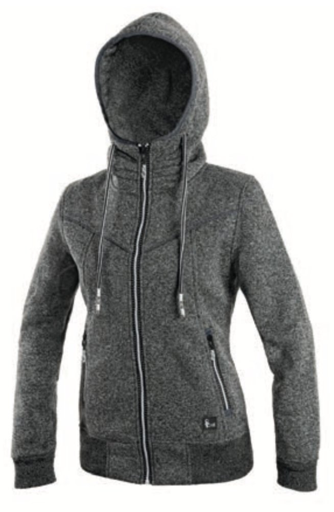 Dámska pletená bunda s pevnou kapucňou má zapínanie na zips. Pás a rukávy sú zakončené pružnou manžetou. Reflexné doplnky. Dve bočné vrecká. Materiál: 100% polyester, 280g. Veľkosť: XS-3XL