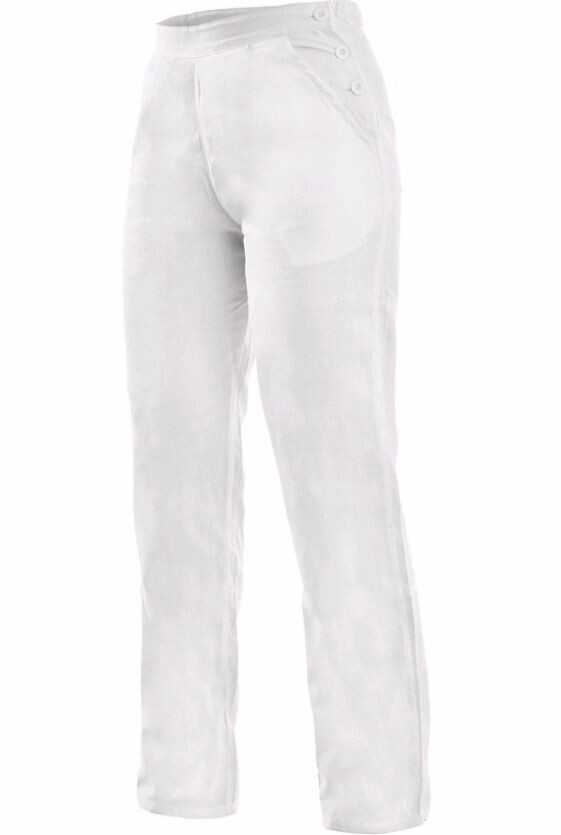 Dámske biele nohavice CXS DARJA do pása. Majú pevný pás, vpredu sú dve vrecká, zapínajú sa zboku na tri gombíky a v zadnej časti majú pútka s gombíkmi na stiahnutie. Materiál: keper 100% bavlna - 190 g/m2. Norma: EN 340. Veľkosť: 36-60