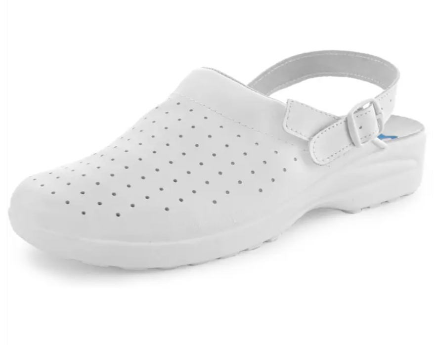 Sandál, dámský, kožený s plnou špicí, perforovaný s polohovatelným páskem kolem paty. Materiál: svršek z přírodní lícové úsně, antistatická, protiskluzová PU podešev.