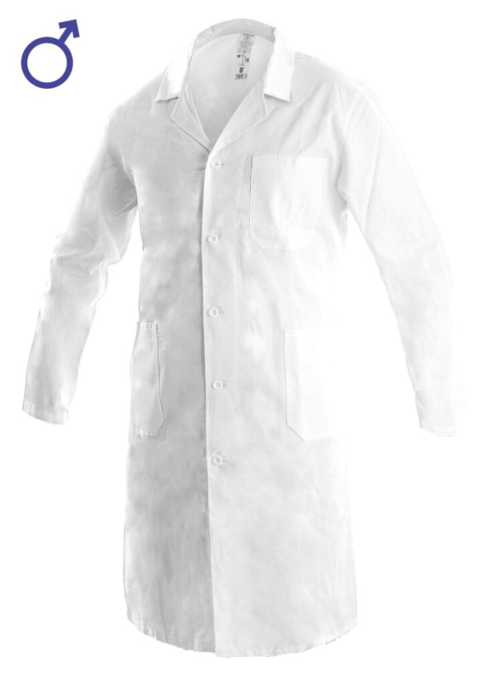 Biely pracovný plášť ADAM s dlhým rukávom pre pánov. Vpredu má 3 vrecká a zapínanie na gombíky. Vzadu je pás s gombíkom na utishnutie. Materiál: keper 100% bavlna - 190 g/m2 Veľkosť: 44-64 Norma: EN 13688