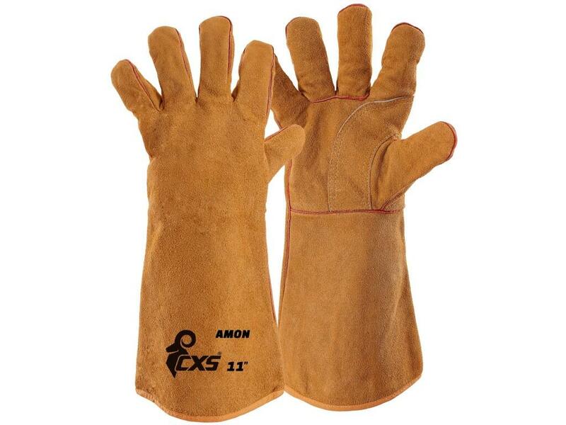 Pracovné rukavice AMON zváračské, základ týchto rukavíc je vyrobený z kože hovädzej štiepenky, odvetvia: strojársky a ťažký priemysel, Norma: EN 388, EN 420 Velkosť: 11 Balenie: 12 párov Kartón: 60 párov