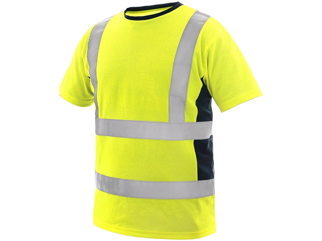 Tričko EXETER kombinuje vysokú viditeľnosť a bezkonkurenčné pohodlie. Je ideálnou voľbou pre letné mesiace. Má okrúhly výstrih v kontrastnej modrej farbe, 2 horizontálne a 2 vertikálne reflexné pásy o šírke 5cm a po stranách panely zo sieťoviny v modrej farbe. Materiál: 55% bavlna 45% polyester, 150g.