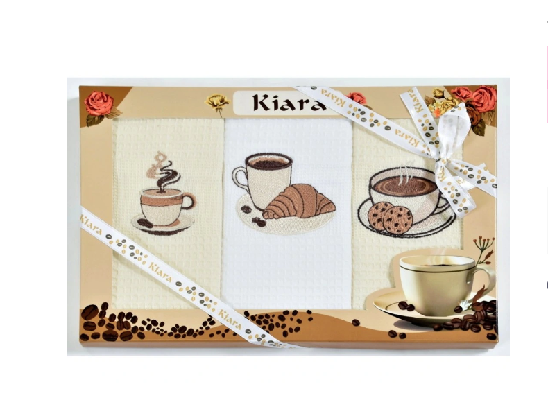 Utierky sú vyrobené z kvalitného bavlneného vaflového materiálu, ktorý má výbornú savosť. Sú vyrobené vo viacerých farebných variáciách a sú doplnené tematickou potlačou . Utierky sú balené v dekoračných kazetách po 3 kusy a sú veľmi vhodné ako darček.